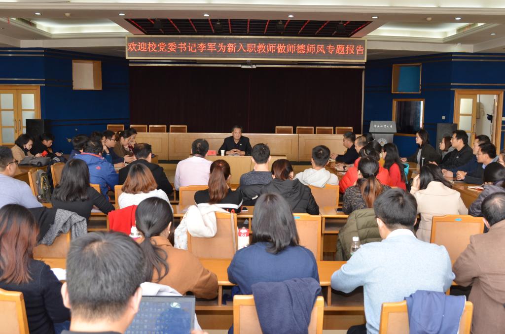 李军首先从何谓师德出发指出作为教育工作者必须要有信念担当,即为培养中国特色社会主义事业的建设者和接班人,担当起自己的责任,要勇于担当、善于担当、甘于担当。李军结合自身经历与切身体会,对新入职教师如何做一名新时代的“四有”好老师提出希望和要求:一是做一个有理想有信念的好老师。作为一名教师,要做到爱国爱党、热爱学生,热爱职业岗位,要有坚定的理想信念,在各自的工作岗位上做到尽职尽责。二是做一个有良好道德情操的好老师。李军从孔子的《论语》到亚当·斯密的《道德情操论》,从“春蚕到死丝方尽,蜡炬成灰泪始干”到“富贵不能淫、威武不能屈、贫贱不能移”,他指出教育是服务业,要有奉献精神,以学生为中心,一切为了学生。三是做一个有扎实学识的好老师。首先要有扎实的知识功底,过硬的教学能力,勤勉的教学态度,科学的教学方法,要勤于学习、善于学习,做到多读书、多实践、多思考;其次要具备一定的辨识力,包括政治辨别力、社会辨别力、学术辨别力、培养辨别力等。四是做一个有仁爱之心的好老师。教学中要围绕学生成长,以温暖的情感、欣赏的眼光,增强学生的信心,用诚实、诚信的态度,树立学生的自尊,用自己的学识、阅历、思考,点燃学生对真、善、美的向往,用自己的激情,激发学生的学习兴趣和学习快乐。
