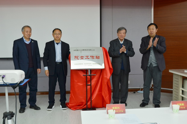 刘嘉麒院士、高鹏副处长、南振兴副校长、于开宁副处长共同为“院士工作站”揭牌