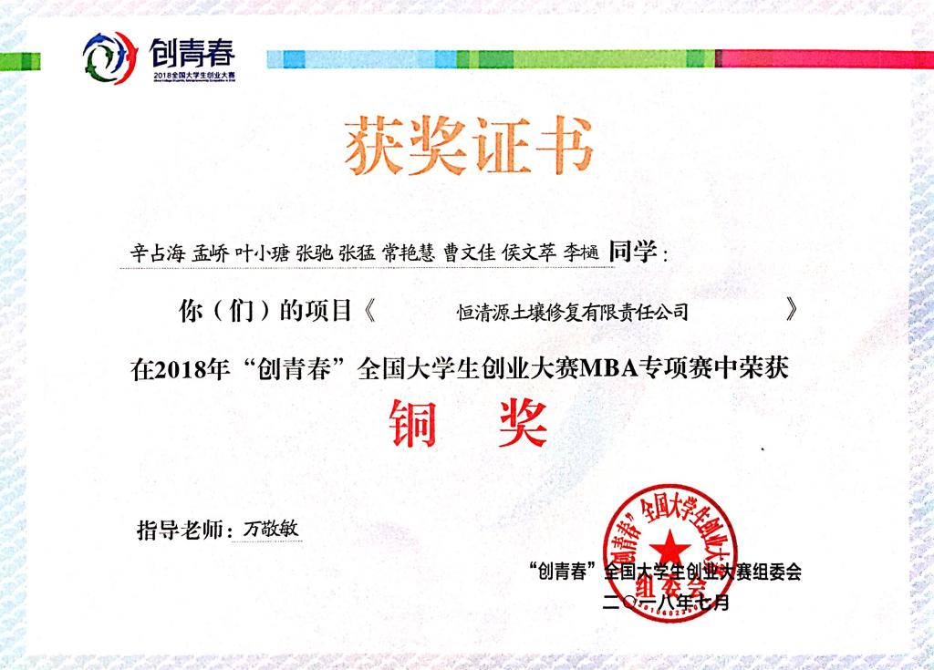 《恒清源土壤修复有限责任公司》指导老师:万敬敏、韩占涛,参与学生:辛占海、孟峤、叶小瑭、张驰、张猛、常艳慧、曹文佳、侯文萃、李樋。