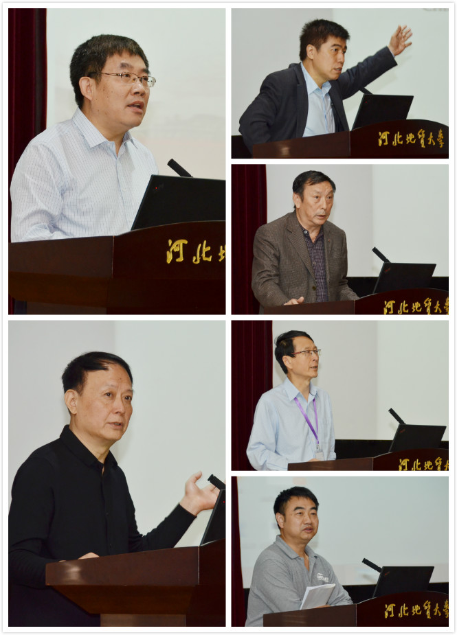 王凤鸣校长致辞(左上),太行智库专家王晓桦(左下)、万广华(右一)、王慧军(右二)、程恩江(右三)、李昌平(右四)作报告