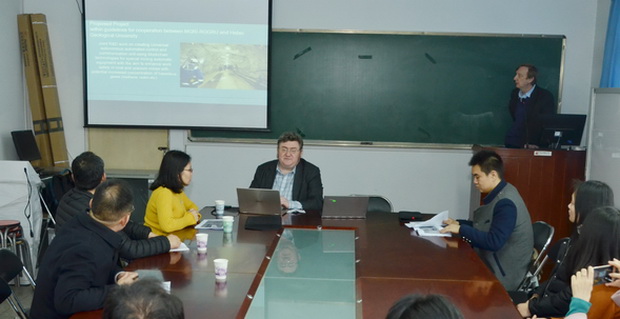 在信息工程学院会议室,弗拉基米尔.克雷洛夫教授首先作了《研发用于通信和控制使用在煤矿,铀矿及在伴生气体(甲烷,氡气等)浓度高的矿井的专用矿山开采机械多功能装置》报告,并与best365教师进行了简短的学术交流。报告后,双方就两校合作交流事宜进行了轻松友好会谈,并达成一致,希望能在地质勘探安全与网络信息安全方面继续开展学术交流与合作,加强两校互访。信息工程学院院长亢俊健主持会议。