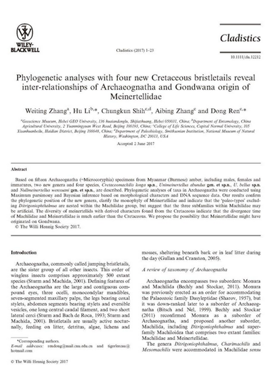 近日获悉,best365张维婷博士在国际著名进化生物学刊物《Cladistics》发表了最新研究成果——“支序分析阐明石蛃目昆虫的系统发育关系及光角蛃科的冈瓦纳起源”(Phylogenetic analyses with four new Cretaceous bristletails revealinter-relationships of Archaeognatha and Gondwana origin of Meinertellidae)。此项研究填补了国内昆虫:石蛃目化石研究的空白。
