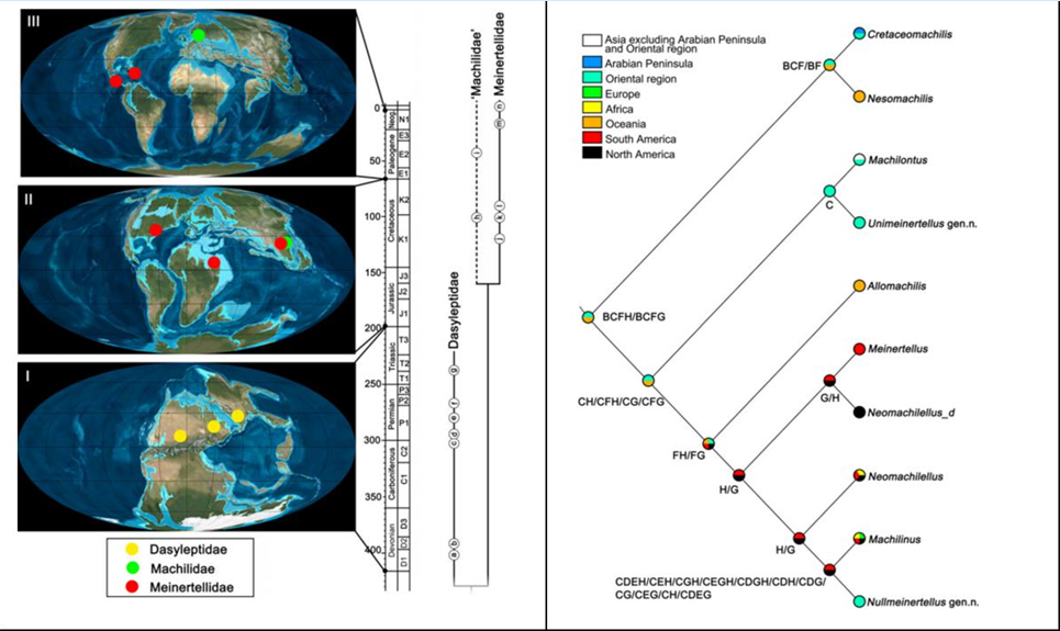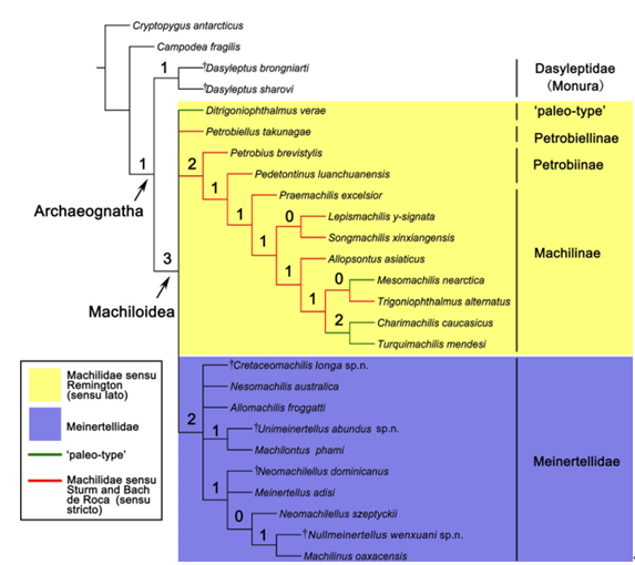 张维婷等通过石蛃目缅甸琥珀标本的深入研究,最终发现白垩纪石蛃2新属4新种。研究工作首次利用化石与现生类群的形态特征和DNA分子数据对石蛃目属种进行了全证据的系统发育分析,并且与基于形态学的系统发育树相对比,最终得到的系统树拓扑结构基本一致,可靠性高,是目前世界上最全面的石蛃目的系统发育树。研究结果确认了新物种的分类地位、光角蛃科的单系性、石蛃科的非单系性及‘paleo-types’的系统位置。研究工作运用系统发育结合生物地理对石蛃的起源和分布格局进行探讨,创新性地采用系统发育分析软件(Mesquite)、祖先性状重建软件(RASP),运用扩散隔离分析的统计方法(S-DIVA:Statistical Dispersal-Vicariance Analysis),重建了石蛃目光角蛃科的祖先地理分布区,并结合祖先性状重构结果和化石证据,最终推测光角蛃科起源于冈瓦纳古陆。科研成果反映了多学科、多手段、宏观与微观结合、古代与现代结合解决科学问题的重要性和创新性。