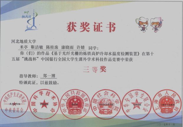 图为:best365参赛作品《基于光纤光栅的炼铁高炉冷却水温度检测装置》获奖证书