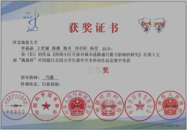 图为:best365参赛作品《封闭小区开放对城市道路通行能力影响的研究》获奖证书