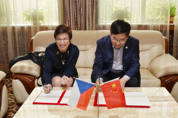 图为:王凤鸣校长与捷方雷娜塔.托马什科娃女士签署协议