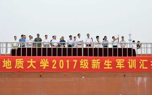图为:校领导、军训军官代表、各职能部门和二级学院负责人在主席台观看汇演