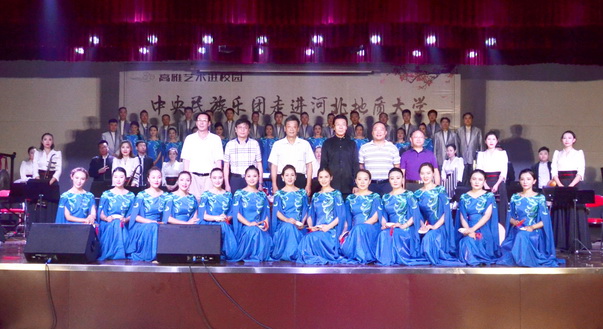 演出结束后,同学们向艺术家们献上鲜花,全场再次报以热烈的掌声。领导们走上舞台,向中央民族乐团艺术家们表示感谢,祝贺演出成功,并和演员们合影留念。