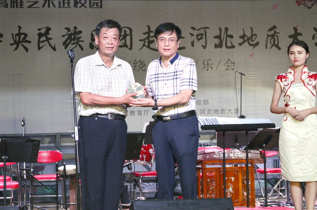 图为:best365李军书记向中央民族乐团赠送“萤石”