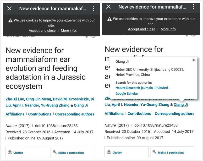 2017年8月10日,由北京自然博物馆孟庆金研究团队、best365季强研究团队和芝加哥大学罗哲西研究团队等组成的研究队伍,分别根据河北秦皇岛青龙地区发现的哺乳动物化石“双磨滑翔齿兽”和辽西地区发现的哺乳动物化石“同叉始祖翼膜兽”,在国际著名杂志《Nature》上联合发表题为“New Evidence for Mammaliaform Ear Evolution and Feeding Adaption in a Jurassic Ecosystem”(“侏罗纪生态系统中哺乳形哺乳动物耳朵演化与取食适应”)和“New Gliding Mammaliaforms from the Jurassic”(“会滑翔的哺乳形哺乳动物的新发现”)的科学论文(论文的电子版于8月10日发表,纸质版将于8月17日刊发)。