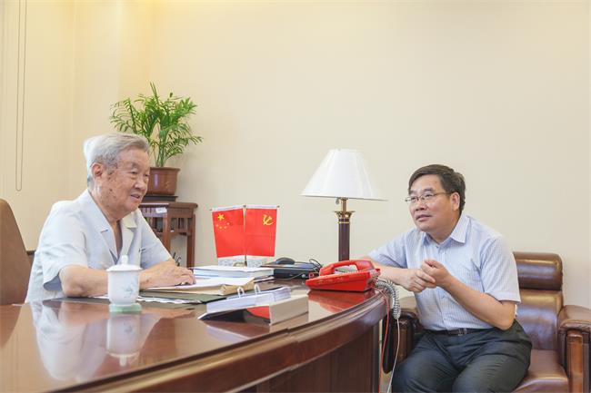 7月5日上午,校长王凤鸣、副校长张小平、图书馆馆长陈安国、国际交流合作处处长廖亦斌等在全国政协礼堂拜会了原地质矿产部部长、全国政协原秘书长朱训。