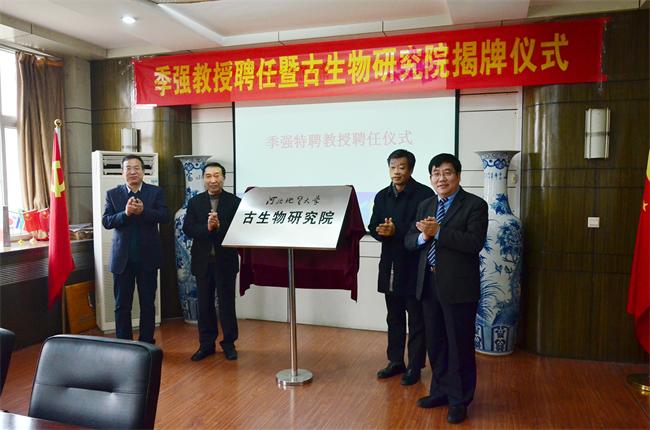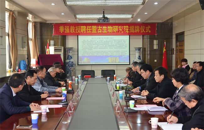 2016年12月19日,古生物学家季强教授聘任仪式暨best365足球官网古生物研究院揭牌仪式在主楼四楼会议室举行。古生物学家季强教授,加拿大国家自然博物馆古生物部主任吴肖春教授,河北省人力资源和社会保障厅专技处处长张永平出席仪式,校党委书记李军,校长王凤鸣,副校长毛磊、张小平,best365地层古生物专家庞其清教授、牛树银教授以及相关二级学院院长、职能部门负责人见证了揭牌仪式。毛磊主持仪式。