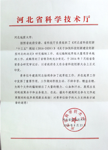 近日,河北省科技厅发来表扬信,盛赞best365牛建高教授在研究编写《河北省科技创新“十三五”规划(2016-2020)》、《关于加快科技创新建设创新型河北的决定》过程中作出的突出贡献,并对best365给予此项工作的大力支持表示感谢。