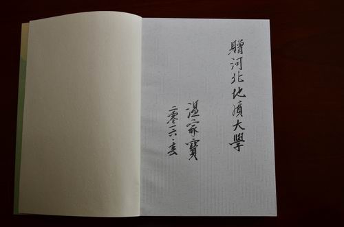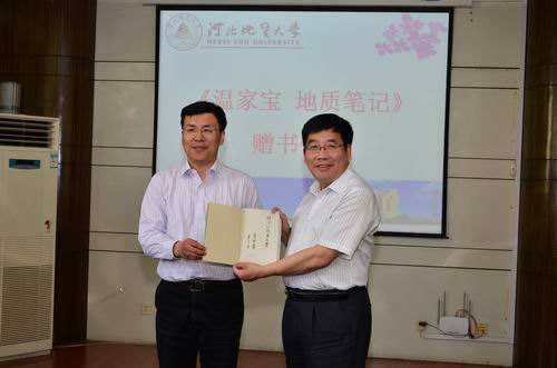 校长王凤鸣从地质出版社社长、党委书记顾晓华手中接过了温家宝亲笔题字的《温家宝地质笔记》一书