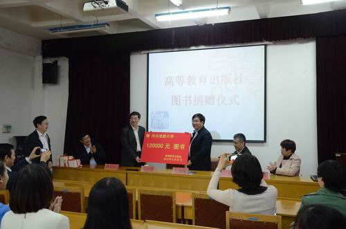 王凤鸣代表学校向高等教育出版社递交了受赠牌,陈安国代表图书馆接受对方赠书。