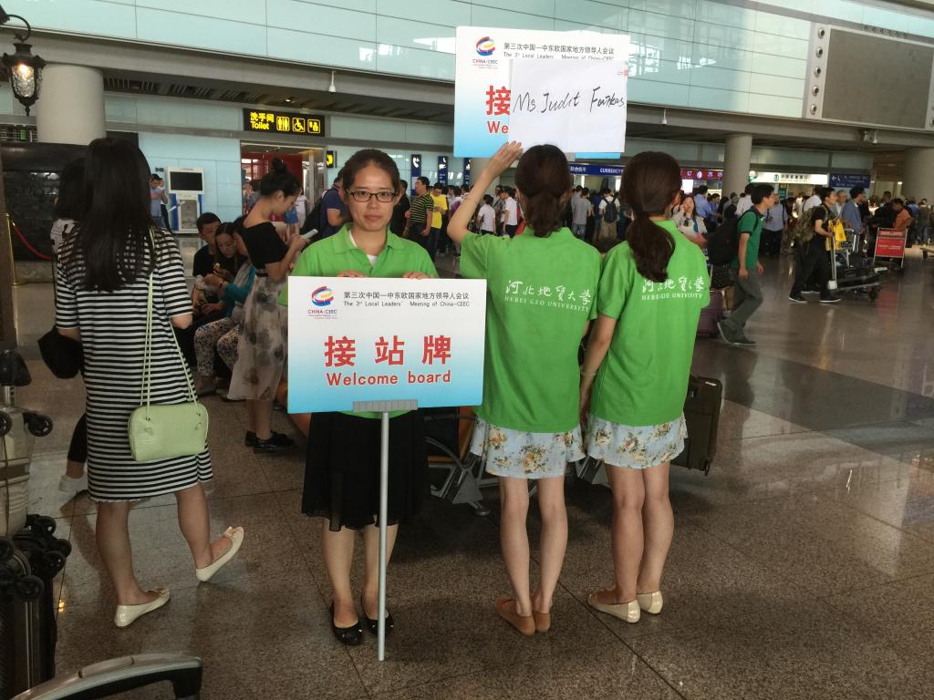 第一批志愿者先是在唐山市外办的统一部署和安排下,于6月15日全天在首都机场迎接前来参会的外宾。她们利用熟练的捷克语和英语,热情地迎接和引导来宾,给他们以宾至如归的感觉。