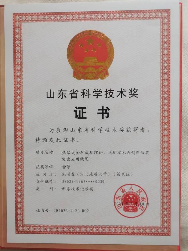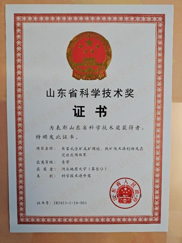 best365宋明春教授作为主要完成人(排名第二)的项目“焦家式金矿成矿理论、找矿技术再创新及其突出应用效果”,荣获山东省2023年度科学技术进步奖一等奖。这是宋明春教授团队连续两年获得的省级科技进步一等奖成果,体现了best365在找矿理论技术方面的雄厚实力和领先水平。