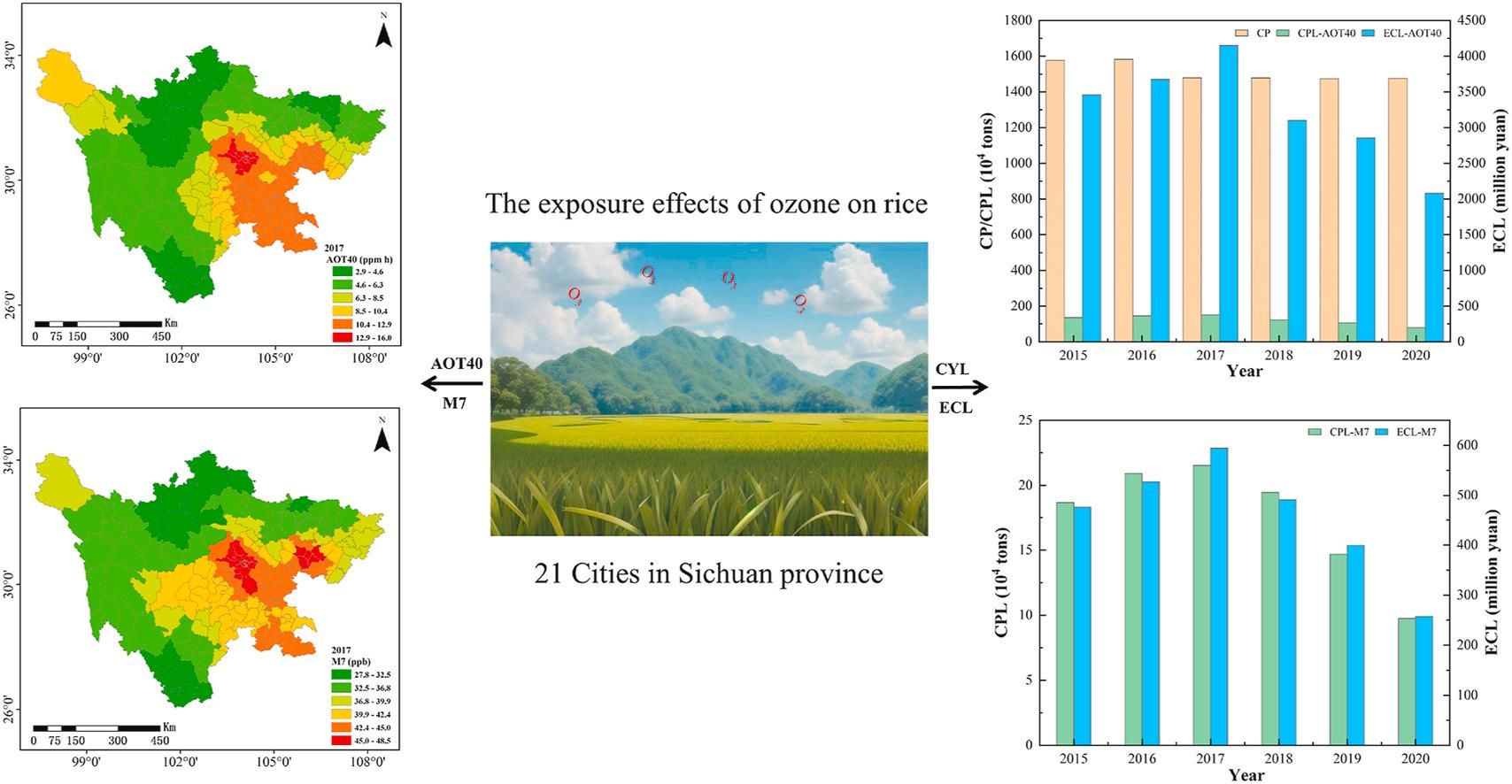 近年来,对流层地表臭氧(O3)浓度显著增加。臭氧污染对生态系统、人类健康和气候变化,特别是对作物生长和产量产生重大不利影响。利用四川省每小时O3观测数据、累计O3浓度(AOT40)和白天平均7小时O3浓度(M7),分析了相对产量损失(RYLs)的时空分布,并对四川省水稻减产和经济损失进行了评价,最小评估单元下沉为县域。结果表明成都平原、川南和川东北地区水稻产量和经济损失较大。这些发现强调了臭氧污染对作物(水稻)产量的潜在风险,并指出了重点区域减少臭氧前体排放的重要性,。建议政府培育耐O3作物,并采取措施减少O3前体的排放,进一步降低O3浓度,从而解决四川因O3污染引起的粮食安全问题;同时由于四川省地形的特殊性,建议在四川不同地区建立当地的水稻暴露响应函数更具有意义。研究结果为四川省有效实施O3污染缓解策略提供了科学依据,也为其他地区粮食安全保障提供了参考。该论文得到了中央引导地方科技发展项目(236Z4203G)及大学生创新创业训练计划国家级项目(202210077004)的资助。