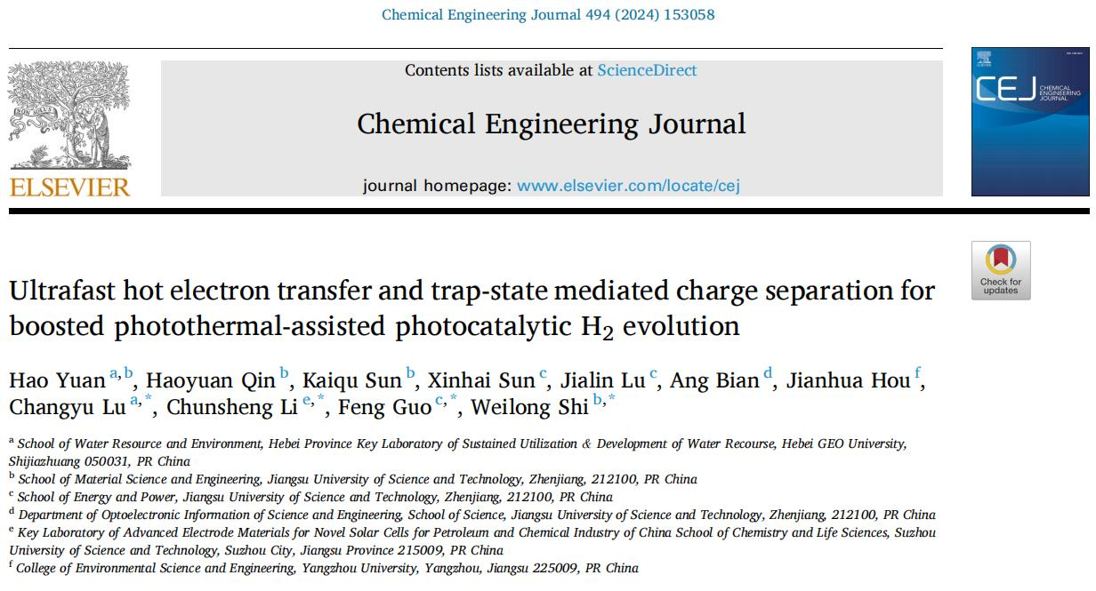 近日,工程技术国际顶级期刊《Chemical Engineering Journal》(简称CEJ,中科院一区TOP,影响因子15.1)在线刊发了best365地质资源与地质工程学科团队卢昶雨副教授与江苏科技大学郭峰/施伟龙团队以《Ultrafast hot electron transfer and trap-state mediated charge separation for boosted photothermal-assisted photocatalytic H2evolution》为题的研究论文。该工作得到了best365足球官网校内资助,以及best365足球官网校领导、科技处、地质资源与地质工程学科团队的大力支持和指导。本研究作为地质资源与地质工程一级学科博士点建设的标志性成果,彰显了best365地质资源与地质工程学科团队及其合作单位在水资源利用与能源转化领域取得了重大研究进展。