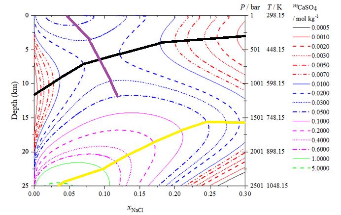 Fig. 10 Constant composition curves representinganhydrite solubilityin NaCl-H2O solutions at an average temperature-pressure conditions within the crust.