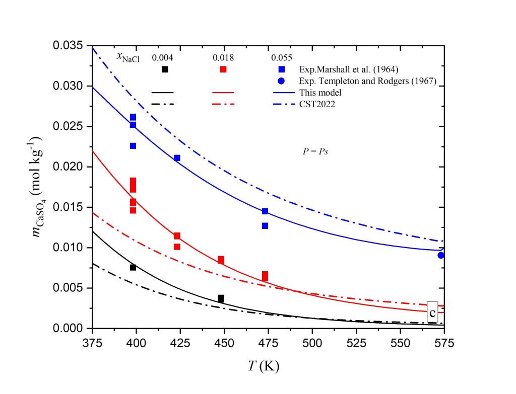 Fig. 5Anhydritesolubilities in aqueous NaCl solutions at saturation pressures(models vs. experimental data).