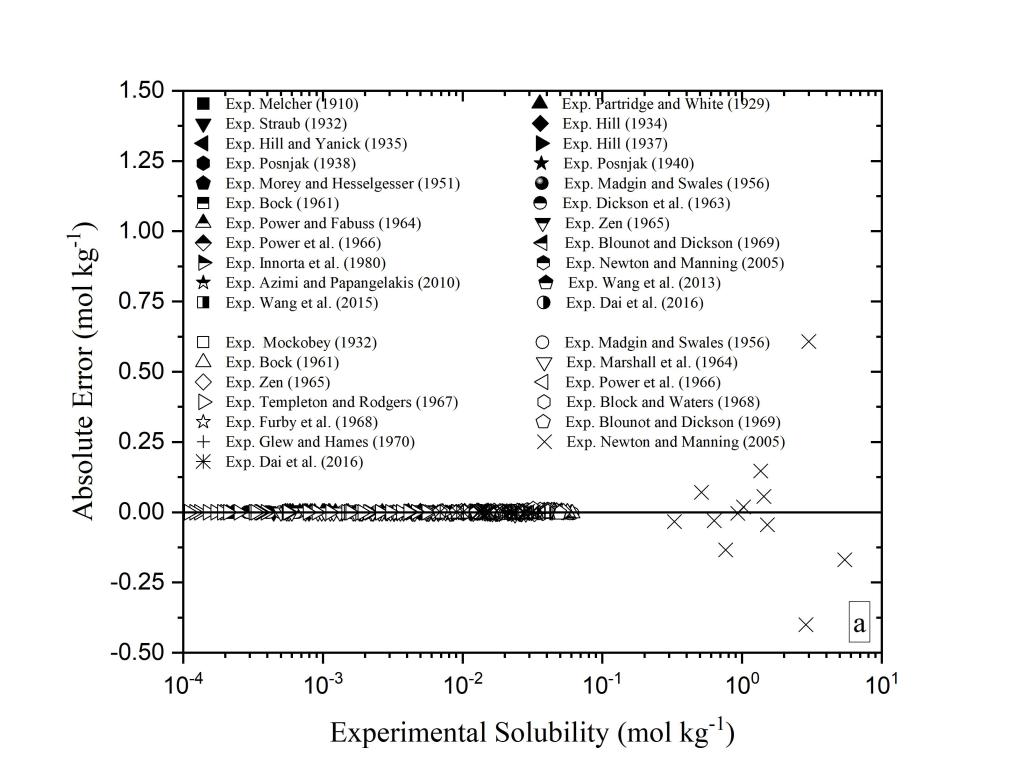 硬石膏矿物溶解度的研究在热液型矿床成矿规律、地热能源利用、CO2强化采油、湿法冶金、海水淡化等领域都具有非常重要的意义。高温高压条件下矿物溶解度的精确实验测量需要耗费大量物力和人力,现有的实验数据不论从精度上还是数量上都不完全能满足地球科学和相关工业研究的需要。适用范围宽、预测精度高的溶解度模型可以在人们感兴趣的物理化学条件下生成模拟数据。目前已有的硬石膏溶解度模型(Creaser, 2022, 图中表示为CST2022)与实验事实相比差距较大。与其它模型相比,本模型在宽广温度压力盐度范围内都具有更好的预测效果(部分图片如下)。
