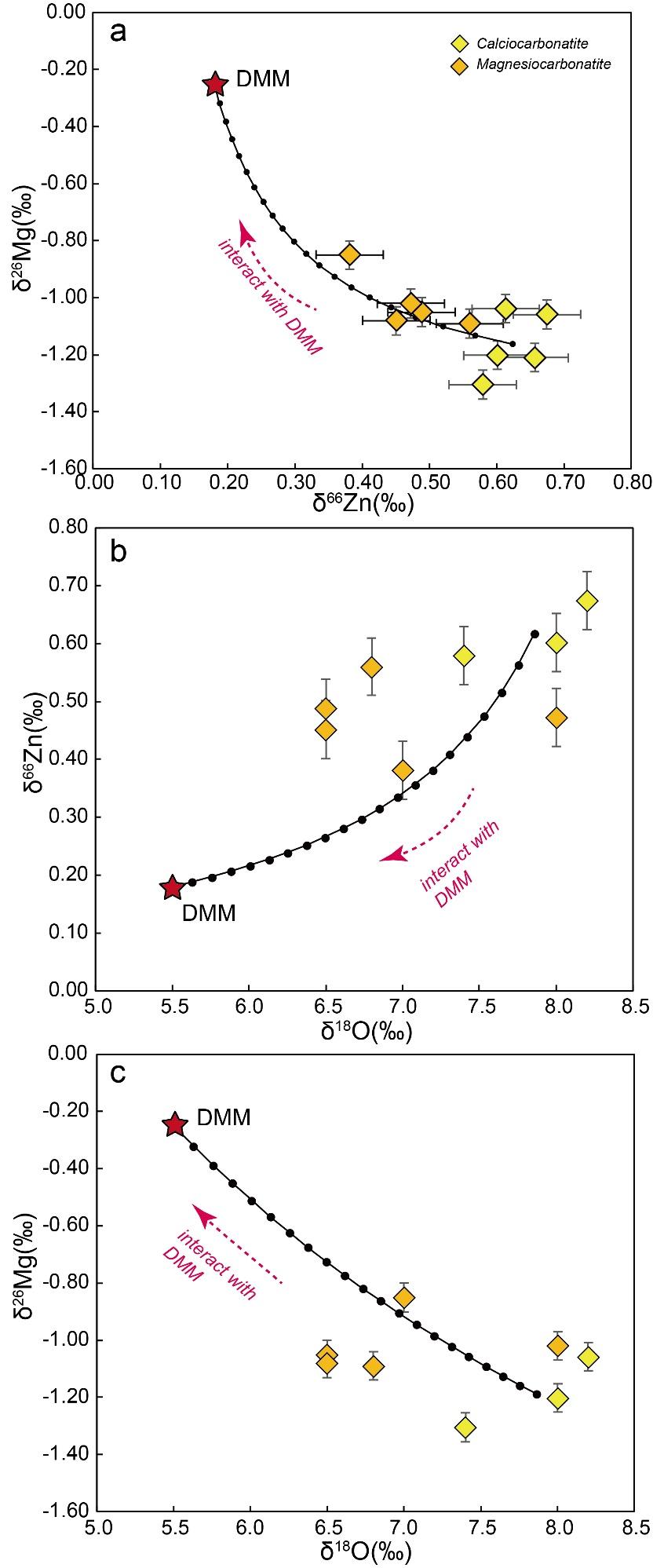 2、根据钙质碳酸岩和镁质碳酸岩的Zn同位素特征,结合前人发表的两种碳酸岩的O-Mg同位素以及主微量元素研究成果(图4),认为钙质碳酸岩是地幔柱携带到浅部地幔的碳酸盐化榴辉岩直接部分熔融形成,镁质碳酸岩则从钙质碳酸岩与地幔橄榄岩反应形成的熔体中结晶形成。
