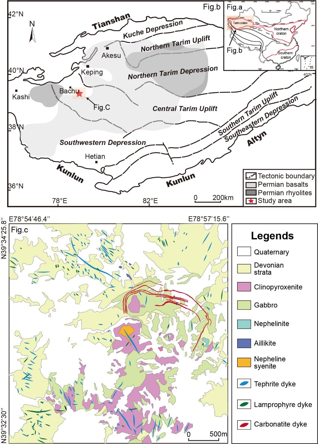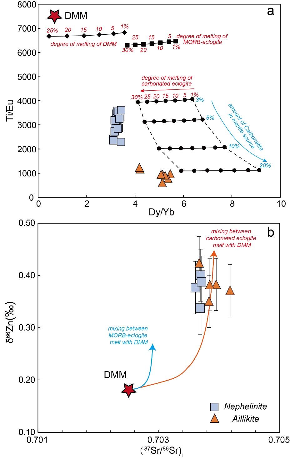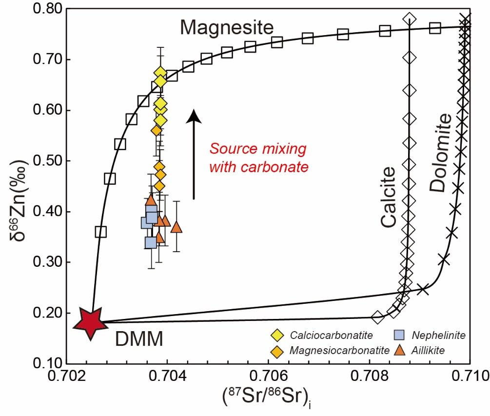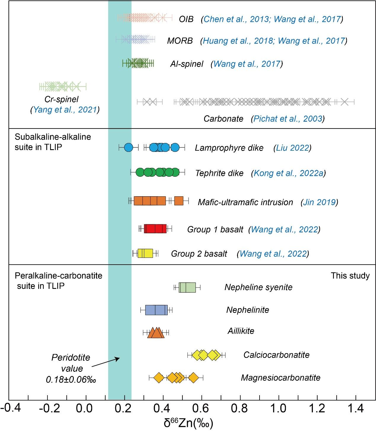 沉积碳酸盐会随着俯冲板块被带入深部地幔,并对深部地幔熔融过程中的温压条件和最终产物产生关键性影响。然而再循环碳酸盐在地幔中的最终储存深度(能否穿过地幔转换带进入到下地幔)以及再循环碳酸盐在地幔部分熔融中的作用仍然存在争议:Dasgupta and Hirschmann(2010)认为俯冲作用会将板片上一半的碳带入到深部地幔中,而Kelemen and Manning(2015)则认为板片上绝大多数的碳都在变质作用和脱水作用影响下随岛弧岩浆作用喷发或进入到岩石圈地幔中去。大火成岩省是短时期内形成的大规模板内岩浆活动(岩浆覆盖面积在105km2以上,体积通常在105km3以上,75%的主体岩浆在1-5Ma内喷发)。研究发现一些大火成岩省源区受到先前俯冲作用的影响,发生了不同程度的碳酸盐化交代富集作用,因此大火成岩省是探究俯冲再循环碳酸盐对地幔熔融影响的重要研究对象。近年来,非传统同位素(Zn, Mg同位素)在示踪地幔是否存在再循环碳酸盐的研究中发挥了重要作用。与广泛报道的玄武质岩石相比,大火成岩省的过碱性岩-碳酸岩系列具有研究深部地幔再循环碳酸盐的独特优势,一方面过碱性岩-碳酸岩通常被认为起源于碳酸盐化的地幔源区,另一方面过碱性岩-碳酸岩通常代表了熔融程度较低,起源较深(甚至可以达到下地幔深部)的熔融产物,因而比玄武岩更有可能保留再循环碳酸盐的地球化学信号。