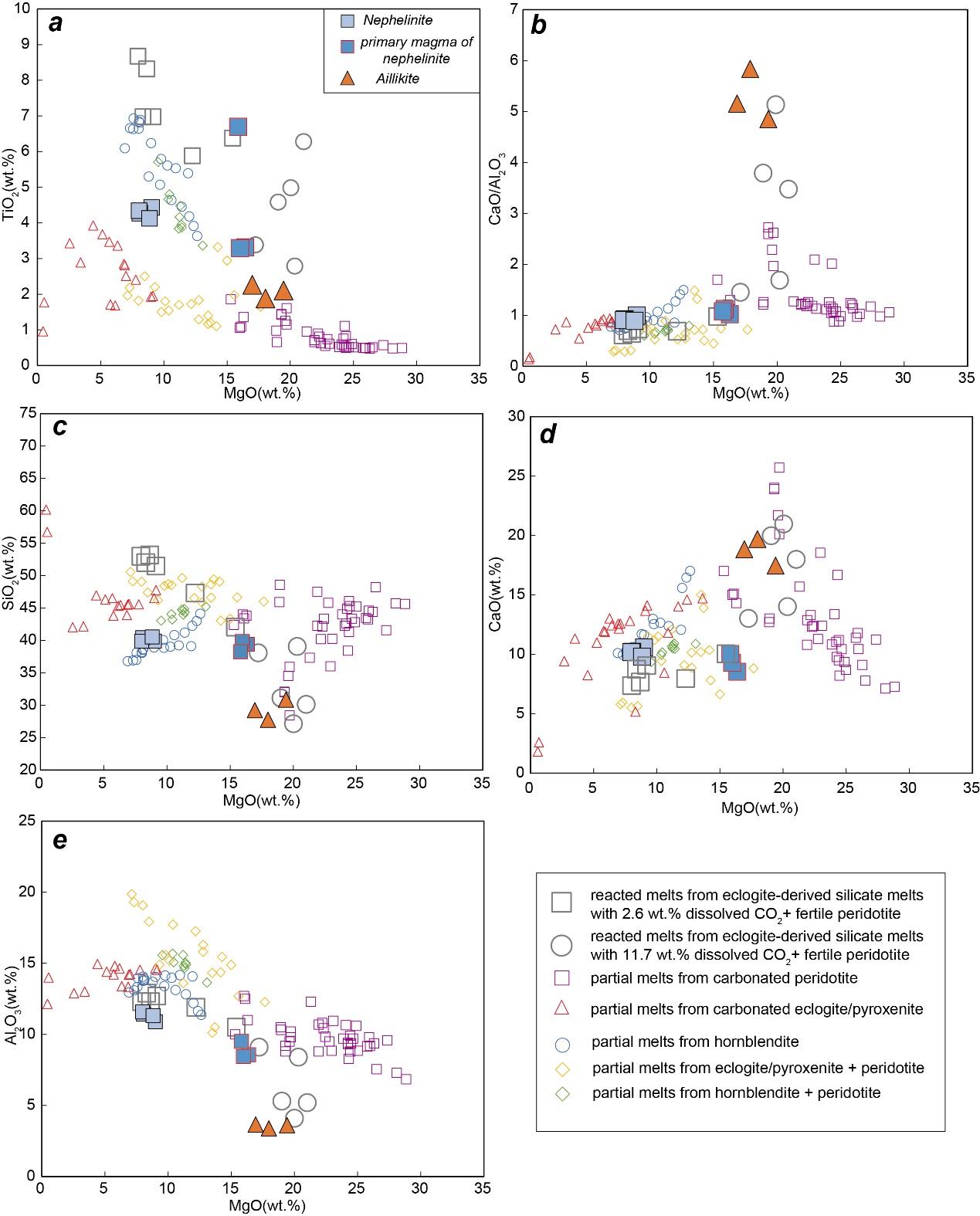 图5瓦吉里塔格方解霞黄煌岩、霞石岩以及霞石岩原始熔体的TiO2、CaO/Al2O3、SiO2、CaO、Al2O3与MgO之间的相关性