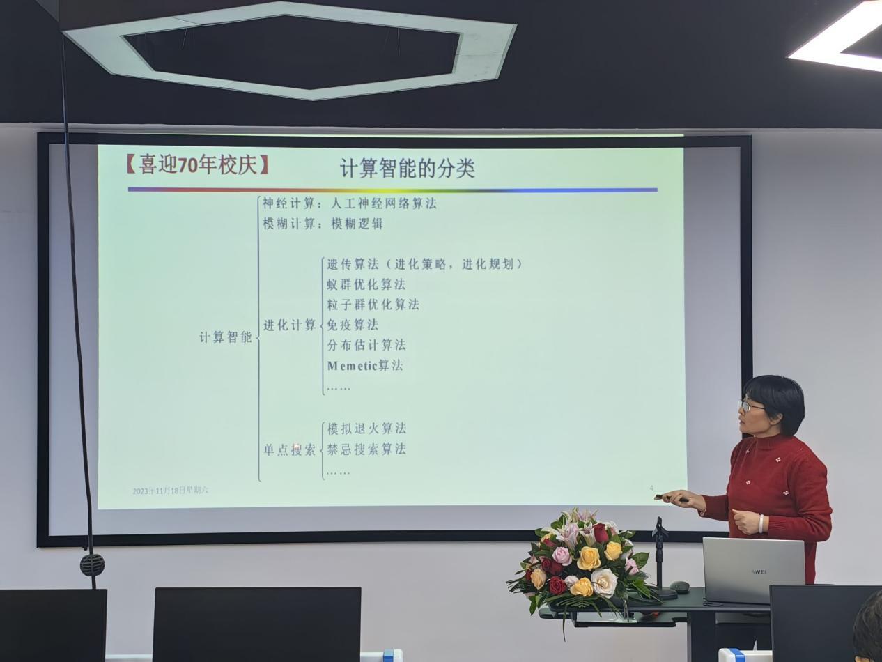 冯艳红教授作了题为“浅谈进化算法求解背包问题”的学术报告,介绍了计算智能算法,属于仿生学派,人工智能的一个分支,重点介绍了计算智能中的粒子群优化算法,及背包问题和研究情况,为电子类师生做了科普。