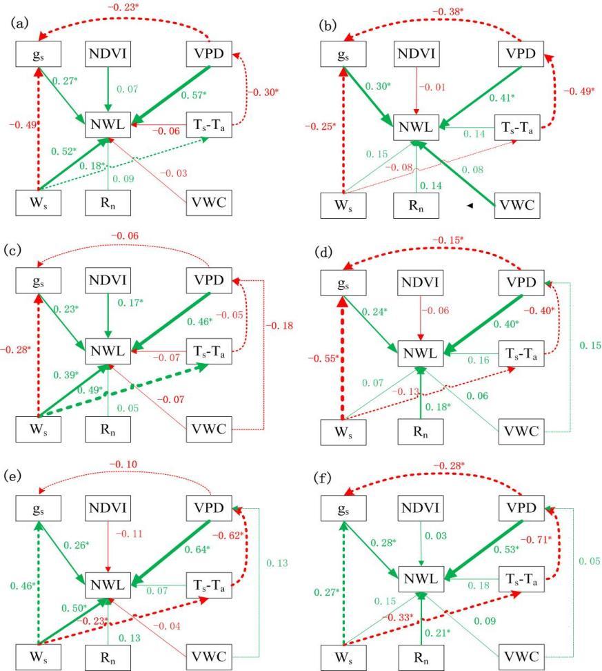 图2.非生物和生物因素对夜间水分流失影响的结构方程分析