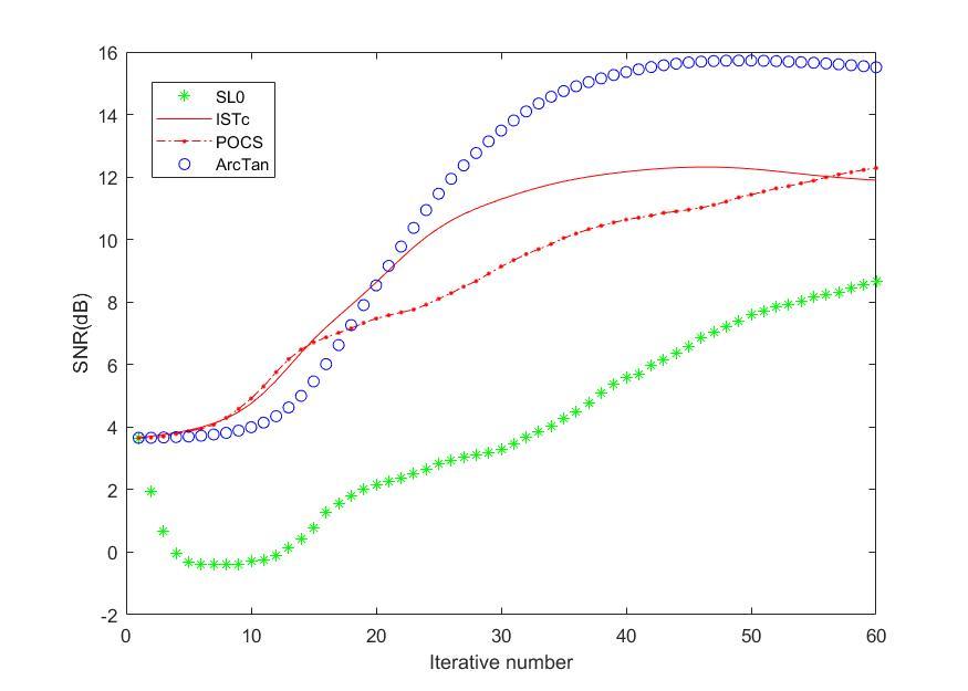 图2.不同方法对图1b数据的插值结果:(a)SL0方法;(b)ISTc方法;(c)POCS方法(d)非凸正则化方法。