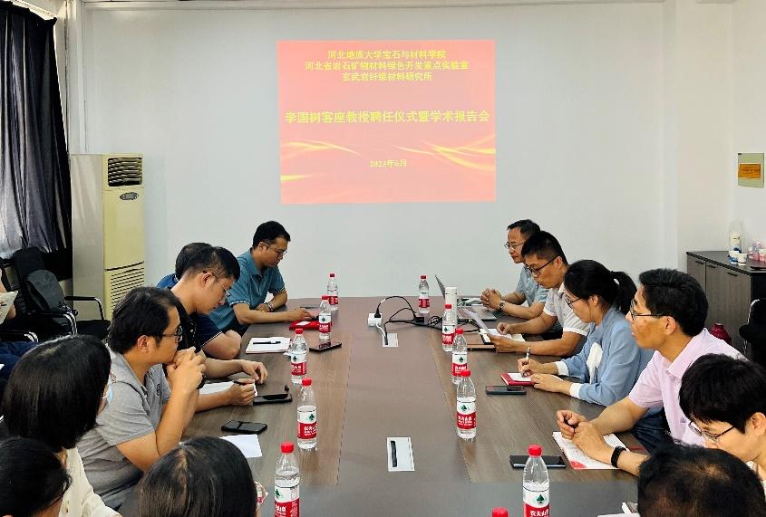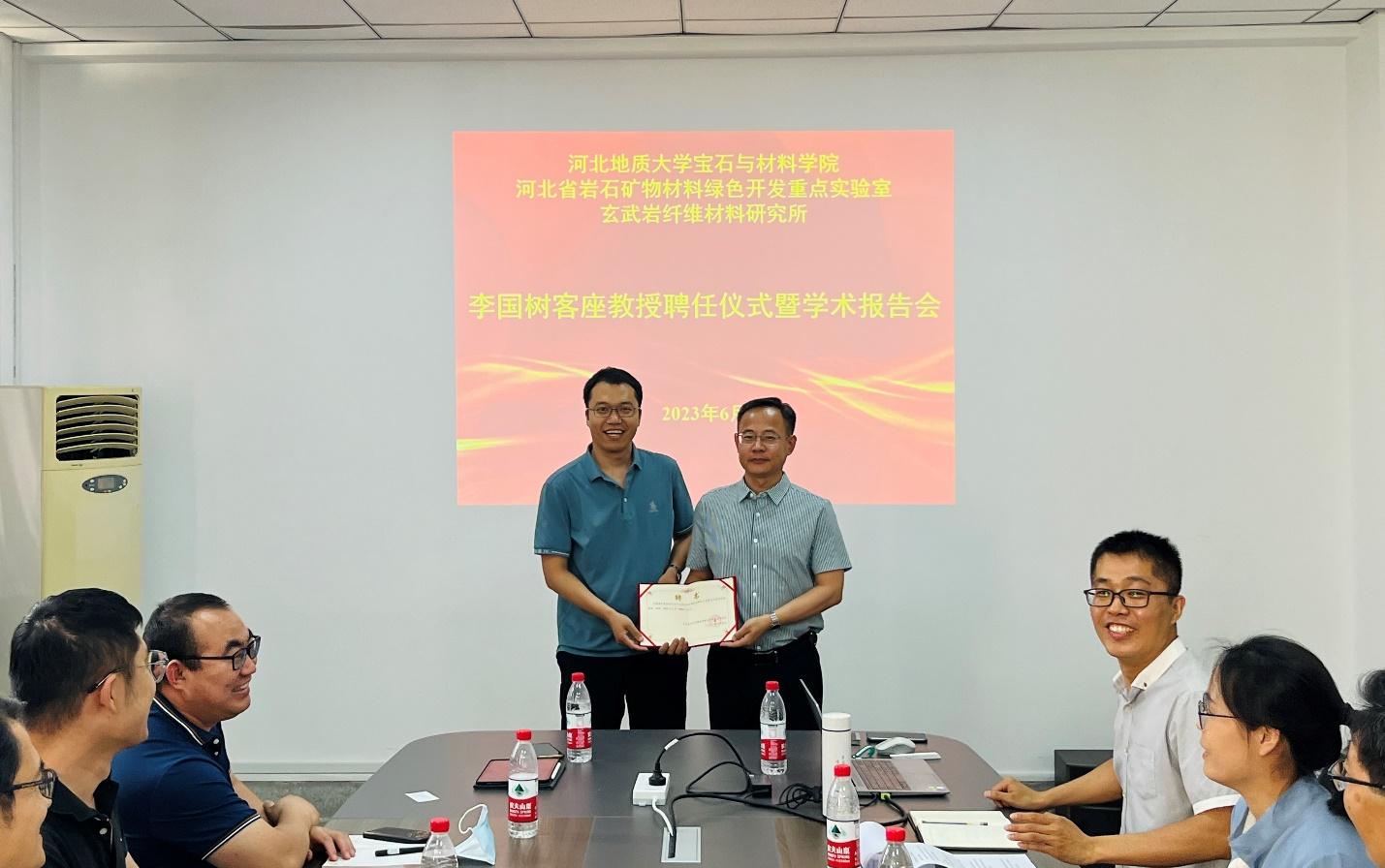 聘任仪式上,杨春成首先介绍了李国树教授的基本情况和学术成就。河北省岩石矿物材料绿色开发重点实验室主任李红超教授为李国树教授颁发客座教授聘书,并代表宝石与材料学院和重点实验室感谢李国树教授对学院和实验室建设发展的关心和支持。他表示,希望李国树教授发挥示范引领作用和自身资源优势,加强与学院和重点实验室的交流合作,为学院和重点实验室争取更多发展资源和发展机遇,助力高质量发展。