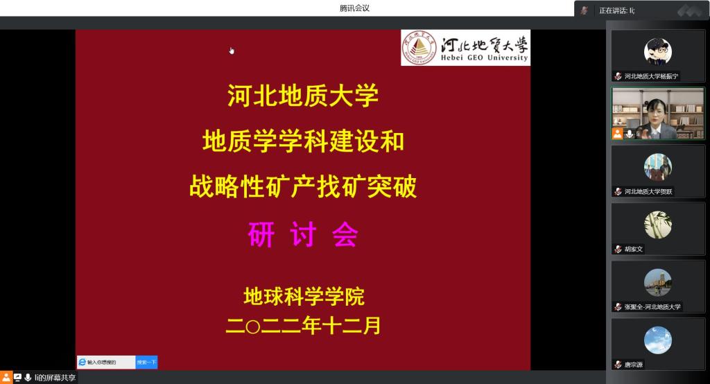 2022年12月9日,地球科学学院在腾讯会议上举办了“地质学学科建设和战略性矿产找矿突破”研讨会,地球科学学院、地质调查研究院、资源与环境工程研究所等单位相关学术带头人、骨干和新入职博士共50余人参加了此次研讨会。会议由地球科学学院副院长李英杰教授主持。