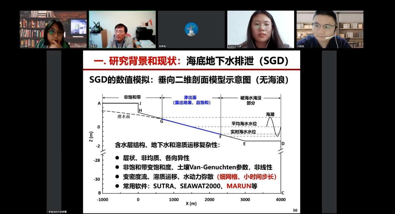 李海龙教授围绕海岸带水文、工程和环境的几个关键热点问题,分别就海滩地下水动力学和漏油污染治理、海潮驱动的地下水位波动及其应用、海潮驱动的包气带水气流及其应用三个方面做了详细的介绍:(1)通过对海岸带地下水-海水相互作用和地下水动态水化学变化规律的研究,把水文地质学、地下水动力学和生物地球化学有机结合起来,揭示了砾石和砂砾混合型海滩被原油污染后长期滞留的机理。(2)完整地考虑了海潮荷载、海底淤泥等弱透水层的越流、弹性储量和上下含水层中海波的相互干涉等综合效应,从机理上解释了某些特殊情况下近岸地下水水位和海潮水位同步波动的现象。(3)揭示了海潮引起的近岸土壤孔隙中气流所特有的工程和生态效应,解释了1999年雨季香港机场路面发生的半径达数米的圆丘状拱起的原因;从根部呼吸的角度定量分析了为何潮间带湿地植物总是在潮水沟附近长势最好。