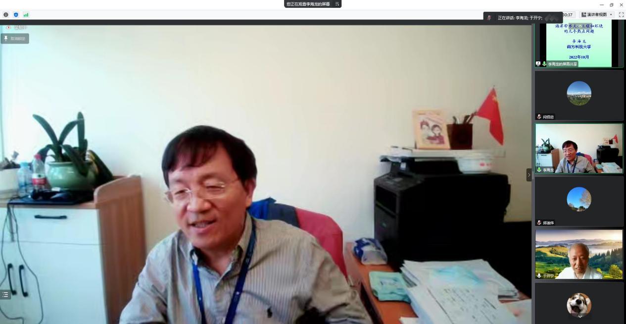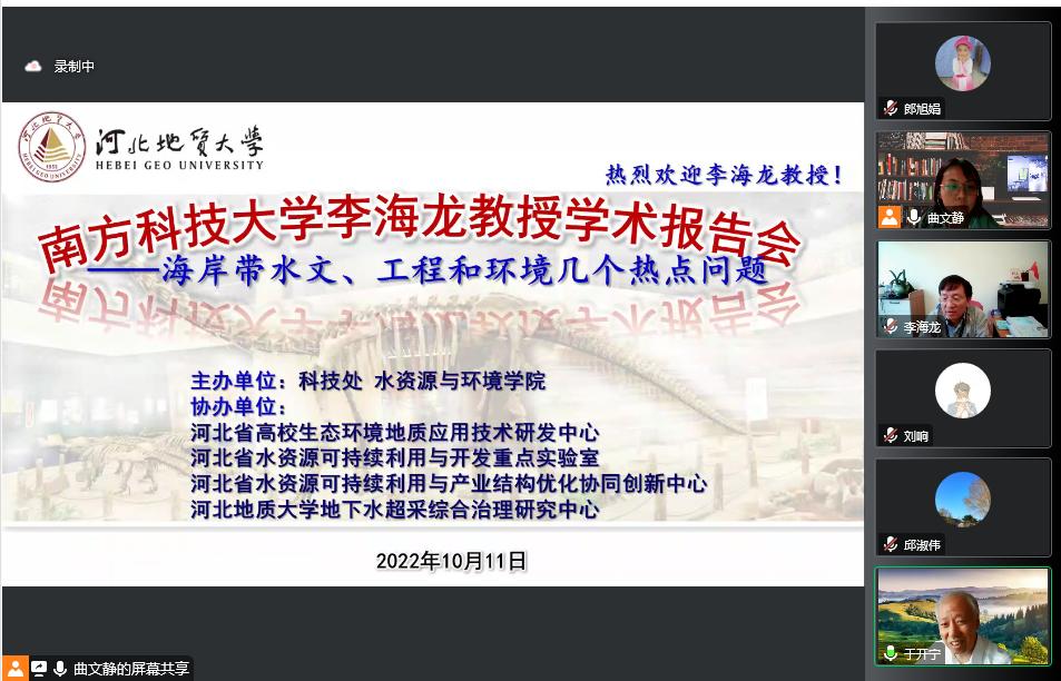 2022年10月11日下午,南方科技大学环境科学与工程学院讲席教授、博士生导师李海龙教授,应邀为best365师生作了题为“海岸带水文、工程和环境的几个热点问题”的学术报告。本次活动由科技处和水资源与环境学院共同主办,河北省高校生态环境地质应用技术研发中心、河北省水资源可持续利用与开发重点实验室、河北省水资源可持续利用与产业结构优化协同创新中心、best365足球官网地下水超采综合治理研究中心协办,采用线上腾讯会议形式。水资源与环境学院院长于开宁教授主持,李铎教授、代锋刚教授等相关学科专业的师生共200余人参加了报告会。