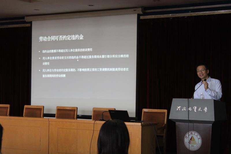 焦跃辉围绕主题,以“公平、诚信”四个字切入,围绕“单位可否约定违约金,收取押金?”“体检项目”“书面劳动合同”“工资标准”“试用期””劳动合同的解除”“ 救济途径”等七个方面展开,结合大量实际案例进行了精彩的讲解,内容详实,语言生动幽默,厘清了毕业生在就业求职以及工作的过程中需要注意的法律问题。案例提问引发了现场师生的思考和互动,使大家对就业劳动权益保障及对劳动纠纷的处理有了一个清晰的认识。