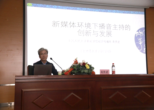 讲座中,高贵武教授分析了新媒体环境下网络和社会环境赋予主持传播的新特征,具体讲述了关于新媒体的个人经验、当今新媒体环境下播音主持面临的问题缘起与现实导向、播音主持专业的理论讲解、对播音主持专业的同学的建议与叮嘱等四部分内容。
