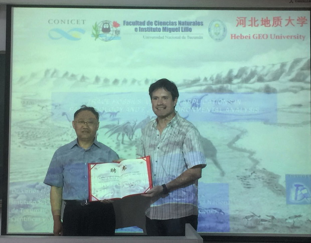为拓展best365古生物专业研究领域,丰富best365古生物学科师生的知识体系,应古生物研究院首席科学家季强教授的邀请,5月9日-16日,阿根廷国家科学技术研究委员会研究员卡洛斯.阿尔弗雷多.康索.冈内拉(Carlos Alfredo Console-Gonella)博士来校讲学,同时被聘为best365古生物专业客座教授。南振兴副校长代表王凤鸣校长为卡洛斯颁发客座教授聘书。