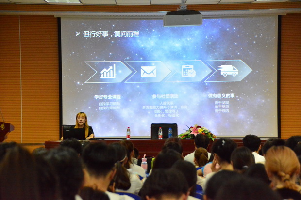 曹月婷根据自己大学四年的学习经历及求职历程,为同学们上了宝贵的一课。她着重就专业知识、社团实践、课外阅读等方面阐述了自己的看法及独到观点。她指出,学好专业知识是一个学生在大学阶段应该做到的基本素养之一,学生对专业知识所掌握的扎实程度,决定了日后的能力以及能够发展的平台的高度。因此,学好专业知识对于学生而言显得尤为重要。同时,积极地参加各类社团活动,从中培养各方面的能力也是一名优秀大学生不可忽视的成长必修课。曹月婷在大学阶段曾担任辩论队教练和文艺部部长的职务,这不仅锻炼了她的应变能力、组织能力和协调能力,丰富的社团活动也为她日后应聘求职打下了坚实的基础。毕业一年,曹月婷从职场新人到部门经理,成为公司入职时间最短、年龄最小的管理者,她用自己的经历告诉同学们,只要有目标,只要肯努力,没有到达不了的高峰。