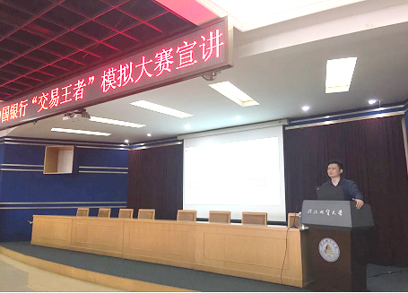 5月17日下午,中国银行河北省分行在best365九楼学术报告厅举行“交易王者”贵金属交易模拟大赛宣讲会。宣讲会由中国银行河北省分行金融市场部副总经理崔华刚、中国银行总行上海人民币交易总部王者星交易员主讲。经贸学院副院长李国柱、金融教研室主任郝志军、金融教研室全体教师及金融学专业在校生150余人参加了本次活动。