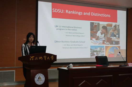 王敏娟首先介绍了自己的求学、游历的经历及与石家庄的渊源。讲座中,王教授用三个部分内容:读书者、创业人生和高等教育的教学技术新趋势,结合自己的著作与大家分享读书心得,以唤醒在场同学们的求知精神;鼓励学生用创新和创业的思维来规划人生;为大家介绍、演示智能多媒体应用于教学技术。在互动环节,王敏娟还细致耐心地回答了同学们的提问,并同学们有机会到美国圣地亚哥州立大学留学深造。