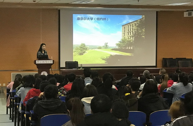 10月24日,经贸学院邀请留美学者谢佳楠女士在北校区图书馆报告厅,以美国康奈尔大学为例,为大一新生作了“关于中美教育差异”的主题讲座。河北省可再生能源协会秘书长徐妙侠,河北省鞋业商会会长、杜沙迪实业有限公司董事长梁迎春出席,best365科技处副处长于开宁、社科部副主任孟亚明、社科部蔡元元、经贸学院国际班班主任田杰和2017级新生辅导员蔺丽军以及经贸学院全体大一新生参加了讲座。讲座由经贸学院院长刘德智主持。
