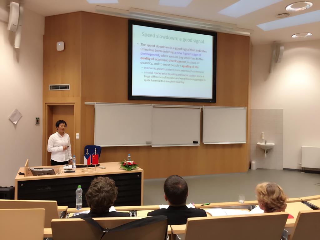 此次国际研讨会是继去年成功举办第一届捷中科学大会之后双方合作伙伴的第二次最新成果展示;此外,还有部分来自波兰和斯洛伐克的学者参加了学术交流。韩劲教授在会上宣讲了题为“中国‘新常态’与人力资本潜力”(China’s New Normal and its human capital potential)的学术论文。韩劲教授首先就“新常态”概念的理解作出阐释,指出中国经济增长速度下降不是坏事,从高速增长降低到中高速增长(2015年中国人均GDP增长速度6.3%),是适宜的增长速度,因为中国的资源环境已经不能承受高速增长带来的压力,必须考虑资源环境的可持续性;高速增长容易带来经济震荡,不利于稳定发展。本轮增速下降是经济进入新的更高发展阶段的一个信号,说明中国的外延粗放增长模式已经进入报酬递减阶段,必须加快转型进入内涵集约发展模式,即新常态。新常态下的经济发展目标要以经济发展质量和民生质量为标准衡量。其次,韩劲以人文发展指数(HDI)和收入不平等指数(Gini,Quintile和Palma)和人力资本(HCI)的国际比较,来度量中国在发展质量、不平等和发展潜力上的差距。最后提出中国新常态下的努力方向。