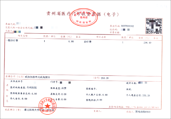 2、其他凭证:(1)校医院转诊记录(暑假或实习期间不用提供);(2)校外门诊病历;(3)如报销暑假期间户籍地发生的门诊医疗费用,还需提供身份证明(身份证或户口本照片);(4)如报销实习期间在实习地发生的门诊医疗费用,还需提供实习证明(需盖实习单位或各二级学院公章)。(5)如提供的票据凭证没有明细项目,如下图: