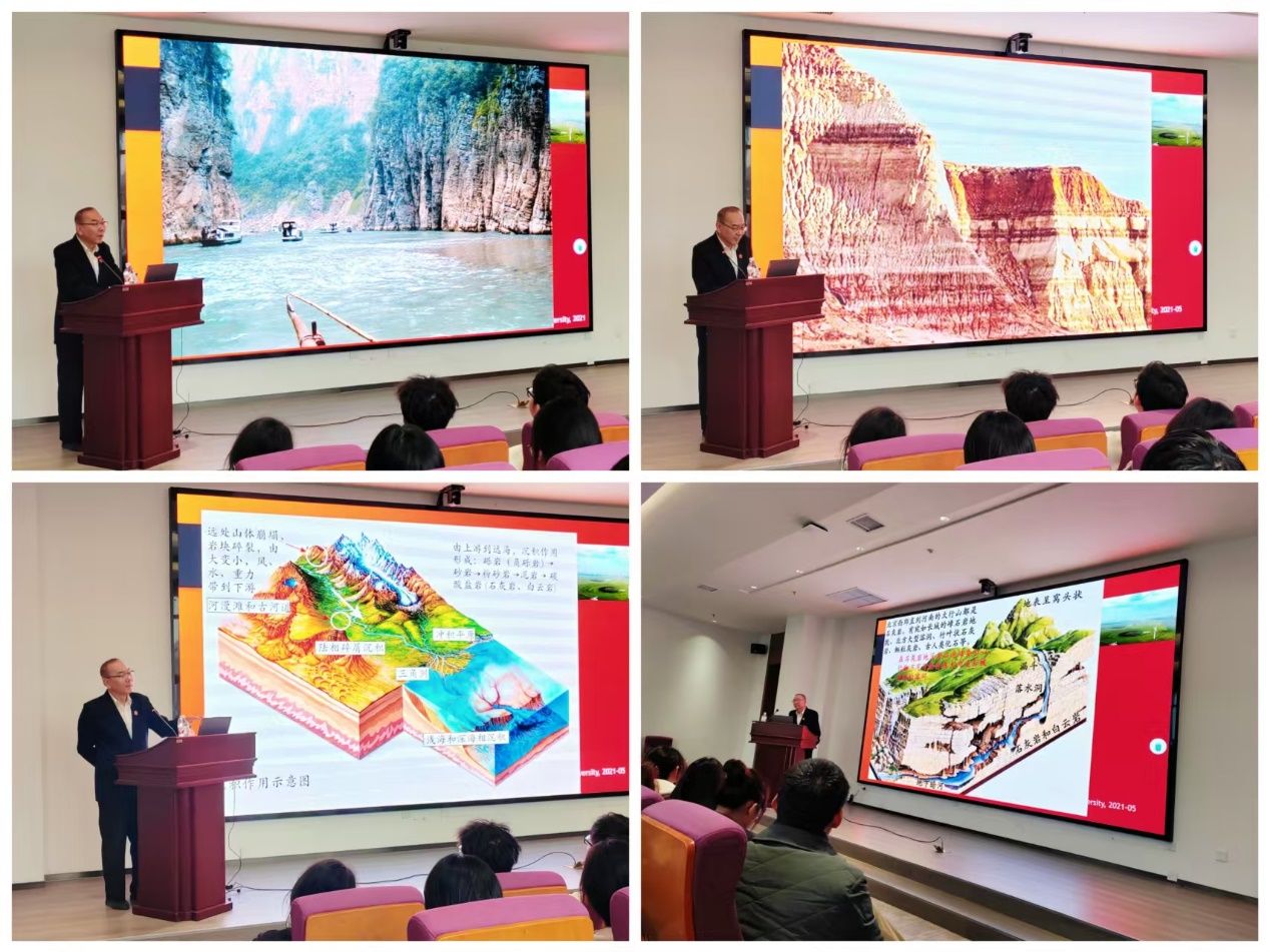 丁教授的讲解深入浅出、妙趣横生。他带领大家领略了中国著名的丹霞地貌、岱崮地貌、嶂石岩地貌、喀斯特地貌等独特景观。结合自身丰富的科研考察经历,丁教授不仅详细讲述了相关的地质知识,还分享了背后的地质文化和地理发现。字里行间,流露出他对祖国大好河山的无限热爱,以及对祖国丰富地貌形态的深深自豪。同学们仿佛置身于一幅幅壮丽的地质画卷之中,沉浸在对大自然鬼斧神工的赞叹里。
