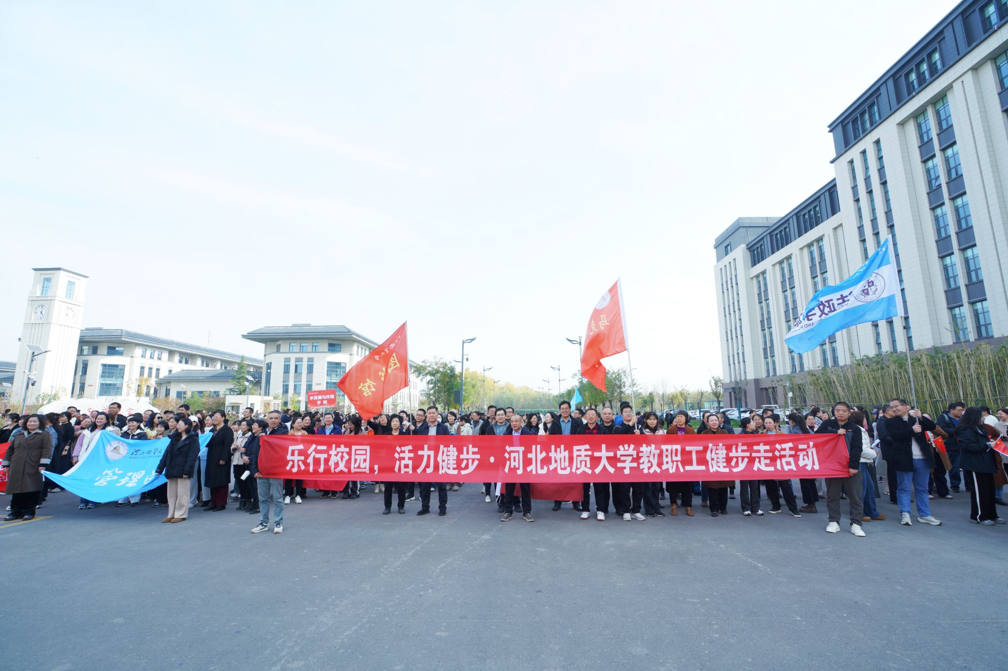 初冬午间,阳光温煦。仰山广场(图书馆北侧)气氛热烈,老师们暂别繁忙的教学与科研工作,从各教学楼、办公室、实验室汇聚于此,精神饱满、笑容洋溢。各分工会的旗帜与横幅迎风招展,营造出浓厚的集体氛围。校工会工作人员及各分工会主席现场协调组织,确保活动顺利启动。