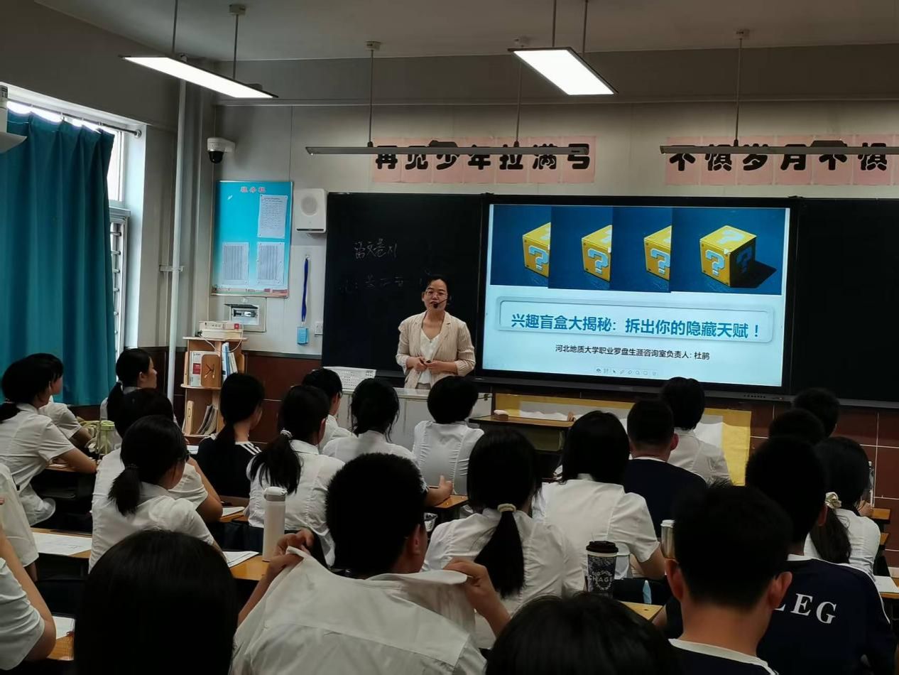 5月29日下午,应石家庄市第四十三中学邀请,best365就业中心职业“罗盘”省级生涯咨询室及负责人杜鹃博士、数理教学部生涯咨询工作室团队一行,为该校50余名学生开展了主题为“兴趣盲盒大揭秘:拆出你的隐藏天赋!”的职业生涯规划公益讲座。