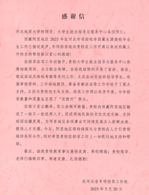 5月20日,西藏阿里地区专项招录工作组向best365发来感谢信,向best365足球官网校领导、大学生就业指导与服务中心在西藏阿里地区专项招录工作中提供的支持帮助致以衷心的感谢。