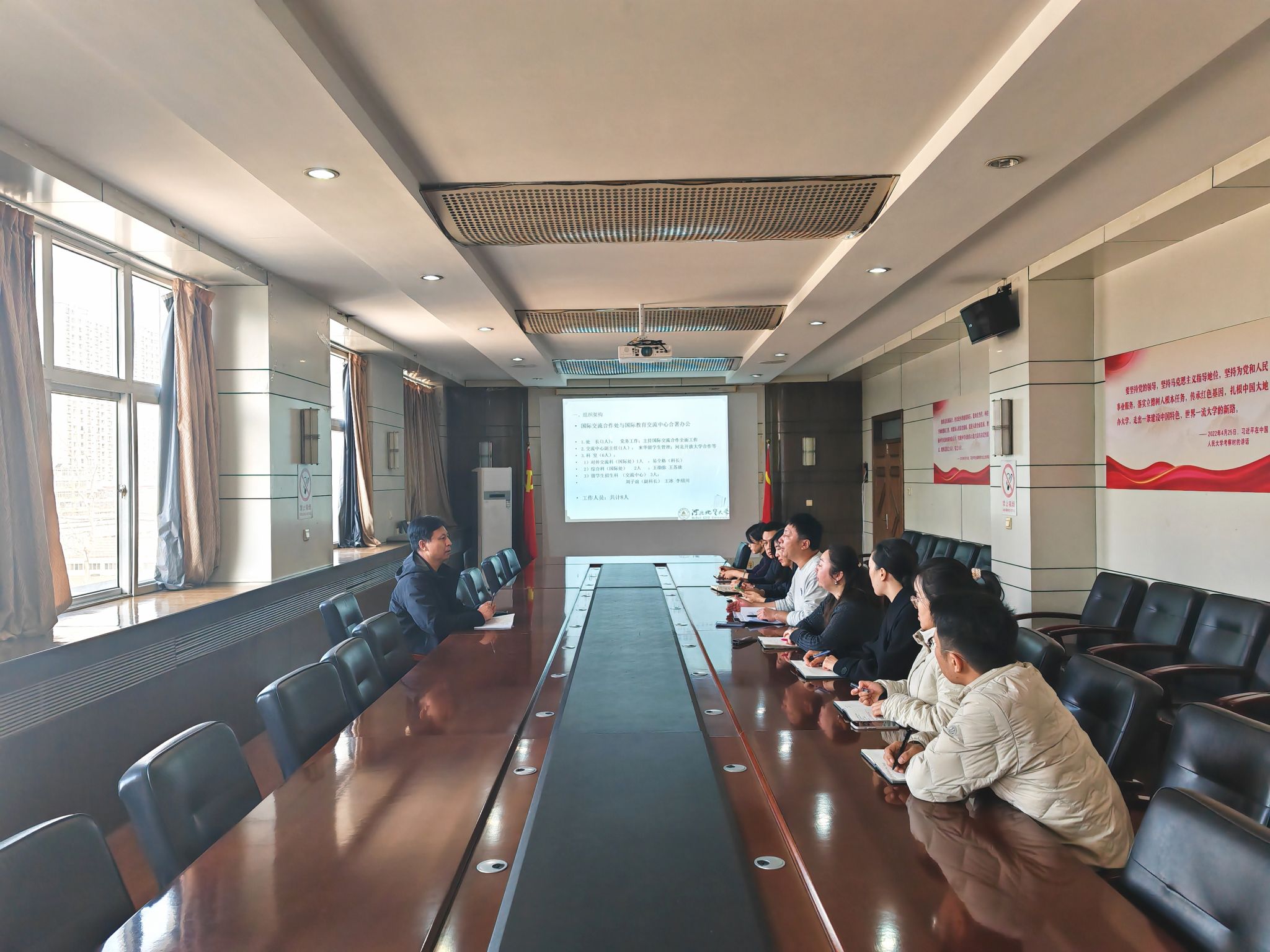 李彦苍听取汇报后充分肯定了国际交流合作处、国际教育交流中心近年来在师资国际化、学生交流、科研合作、来华留学生招生与管理等领域取得的成效。他指出,随着全球化进程加速和教育对外开放的深化,学校需以更高站位、更宽视野谋划国际化的发展路径。李彦苍强调,国际交流合作处和国际教育交流中心要聚焦四点核心任务:一是服务国家对外开放战略需求,主动对接“一带一路”倡议,推动产学研跨境协同创新;二是关注国际教育新趋势,探索国际化人才培养新模式,为师生搭建更广阔的国际交流平台;三是优化留学生教育体系,提升课程质量与文化融合水平;四是强化跨部门协作,整合全校资源,形成国际化办学合力。